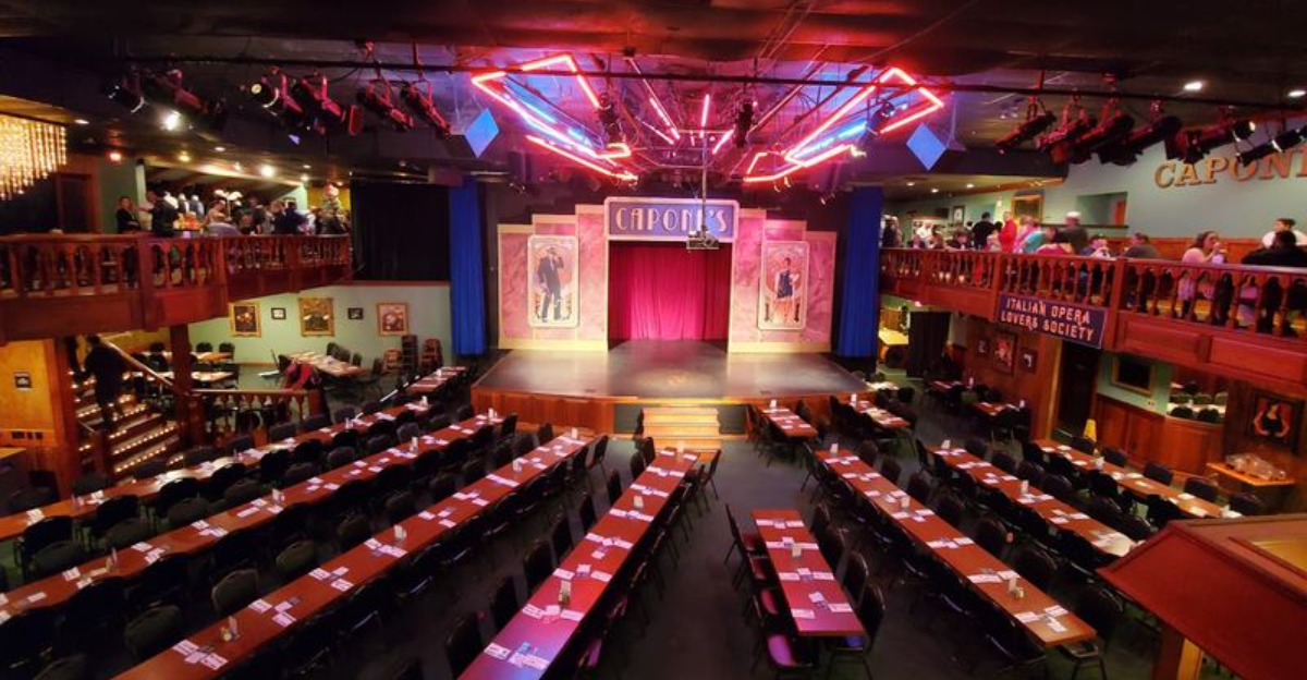 Step into the Roaring Twenties at this gangster-themed venue where mobsters, flappers, and crooked cops run the show. Capone’s immerses you in Prohibition-era chaos from the moment you walk in, with costumed characters greeting you like you just stumbled into an illegal speakeasy. The performers stay in character, cracking jokes and working the room while you settle in for the night.