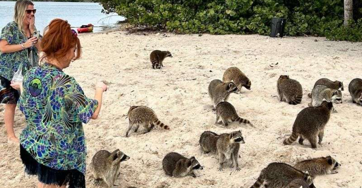 Yes, these raccoons seem tame and friendly, but they’re still wild animals with teeth and claws that can absolutely break skin if they feel scared or cornered. Most interactions go smoothly when you stay calm, move slowly, and let them approach you rather than chasing them around the island like you’re in some kind of raccoon rodeo.