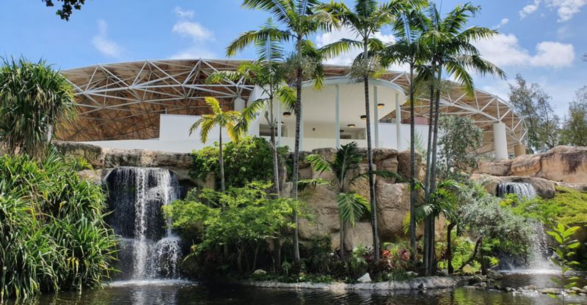 The visual contrast between the lush Florida vegetation and the Japanese design elements is genuinely striking.